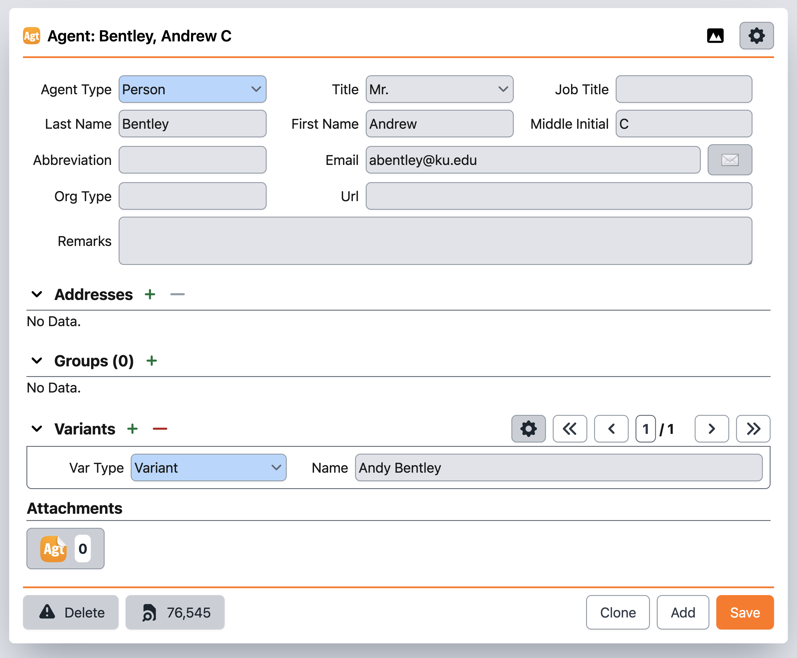 In addition to capturing variants, we encourage you to add ORCID and/or Wikidata IDs to agents using the Agent Identifiers system. This will allow you to uniquely identify them, regardless of any future name or status changes: