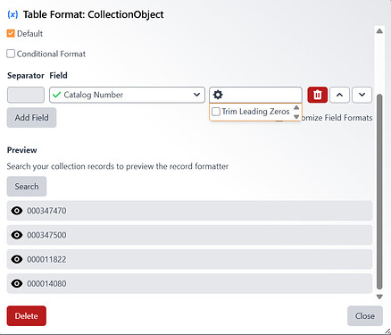 In between the field and the delete button there is a gear to configure the field, when pressed this opens up a “Trim Leading Zeros” checkbox. This is unchecked by default and when checked it will remove any leading zeros from a numerical field.
