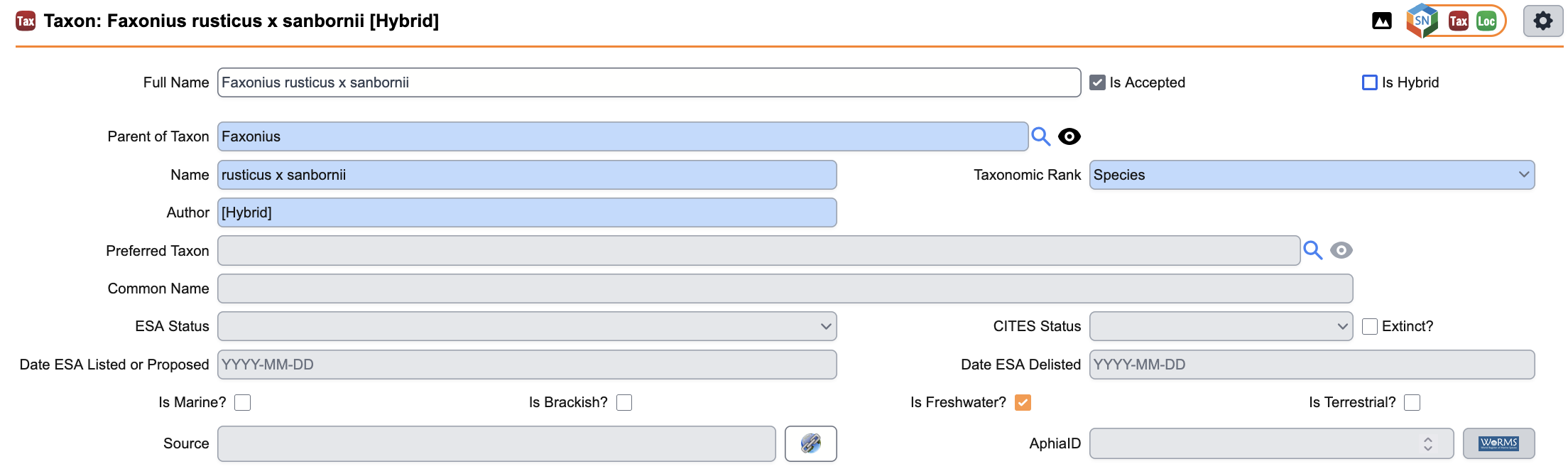 Namefield, enter the hybrid portion of the name (e.g.,caprodes × phoxocephala). - On the taxon form, check the