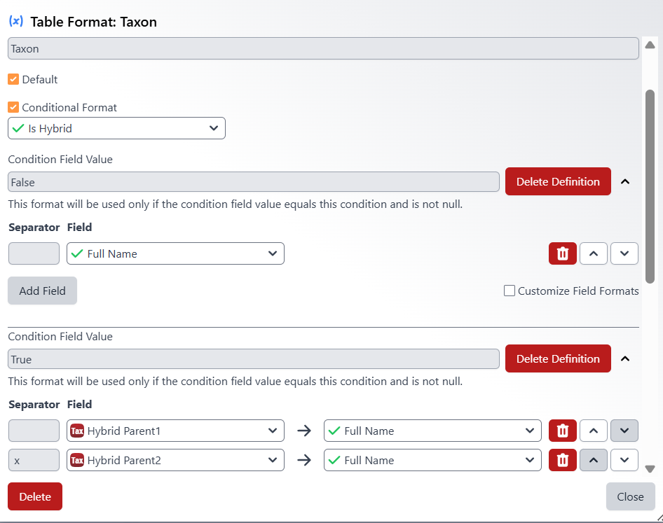 With this format in place, any query or report that uses the (formatted) version of the taxon name will automatically display the full hybrid parentage for records marked as hybrids, while showing the standard full name for all other taxa.
