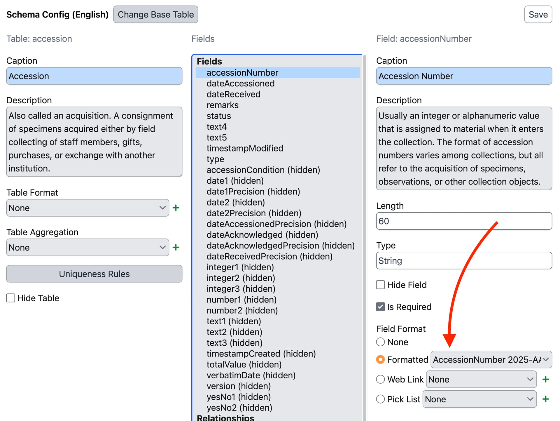 In this example, I am looking at “Accession Number” in the "Accession table. It has a format assigned by default.