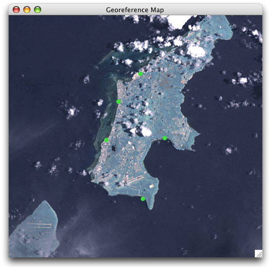 The Record Mapping Tool displays the Latitude and Longitude points as a green dot on a satellite map. The map includes rivers and political boundary overlays. The maps are obtained from a pair of map servers, one hosted by NASA and one hosted at the University of Kansas.