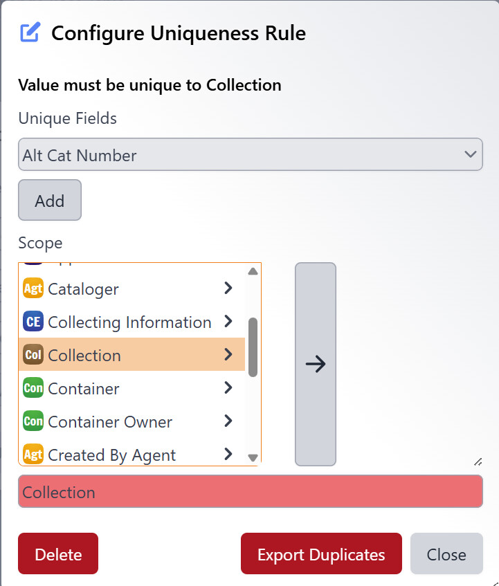 The Uniqueness Rules are fundamentally set at the discipline level (excluding globally-scoped rules), meaning all collections within that discipline will adhere to those rules. This request could be added to New Feature Requests, but the current configuration was intentional and carefully considered before the implementation. If you do move forward with this and need any guidance on removing duplicates for those collections in batches, please let us know!